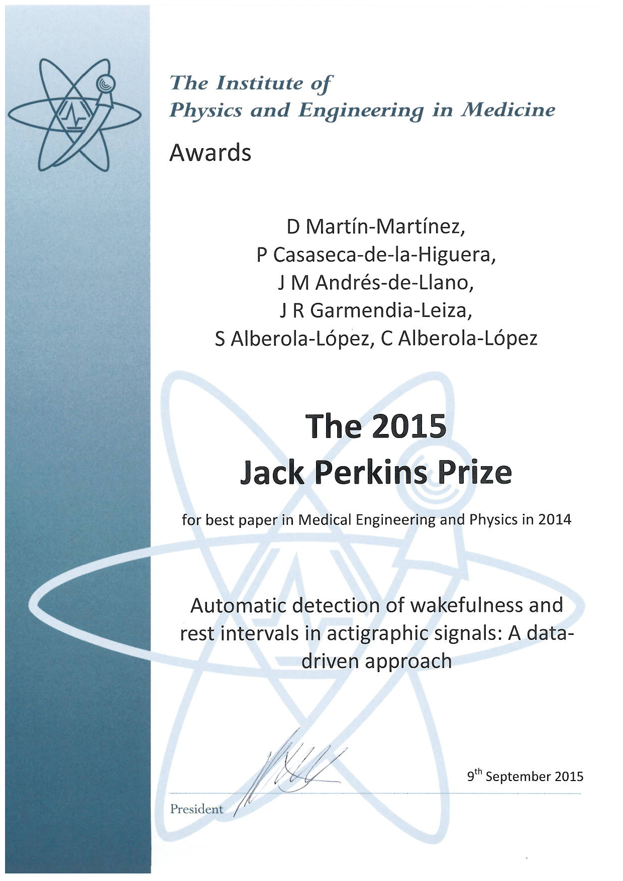 The 2015 Jack Perkins Prize for the best paper in the journal Medical Physics and Engineering has been awarded to the 2014 paper entitled "Automatic detection of wakefulness and rest intervals in actigraphic signals: A data driven approach" co--authored by Diego Martín-Martínez (former PhD student at LPI and currently at Ernst and Young), Pablo Casaseca-de-la-Higuera (currently at the University of West Scotland at Paisley), the physicians Jesús Andrés-de-Llano, J.R. Garmendia and Susana Alberola-López, and by Carlos Alberola-López, professor at the University of Valladolid. The added value of this paper is the absence of a traning stage, i.e., the method is fully automatic and it is based solely on models and thresholds determined from the data to be analyzed, hence the last part of the title "a data driven approach". This method has been applied to the analysis of actigraphic data in children to help diagnose ADHD as well as on senior people to analyze their sleep patterns.